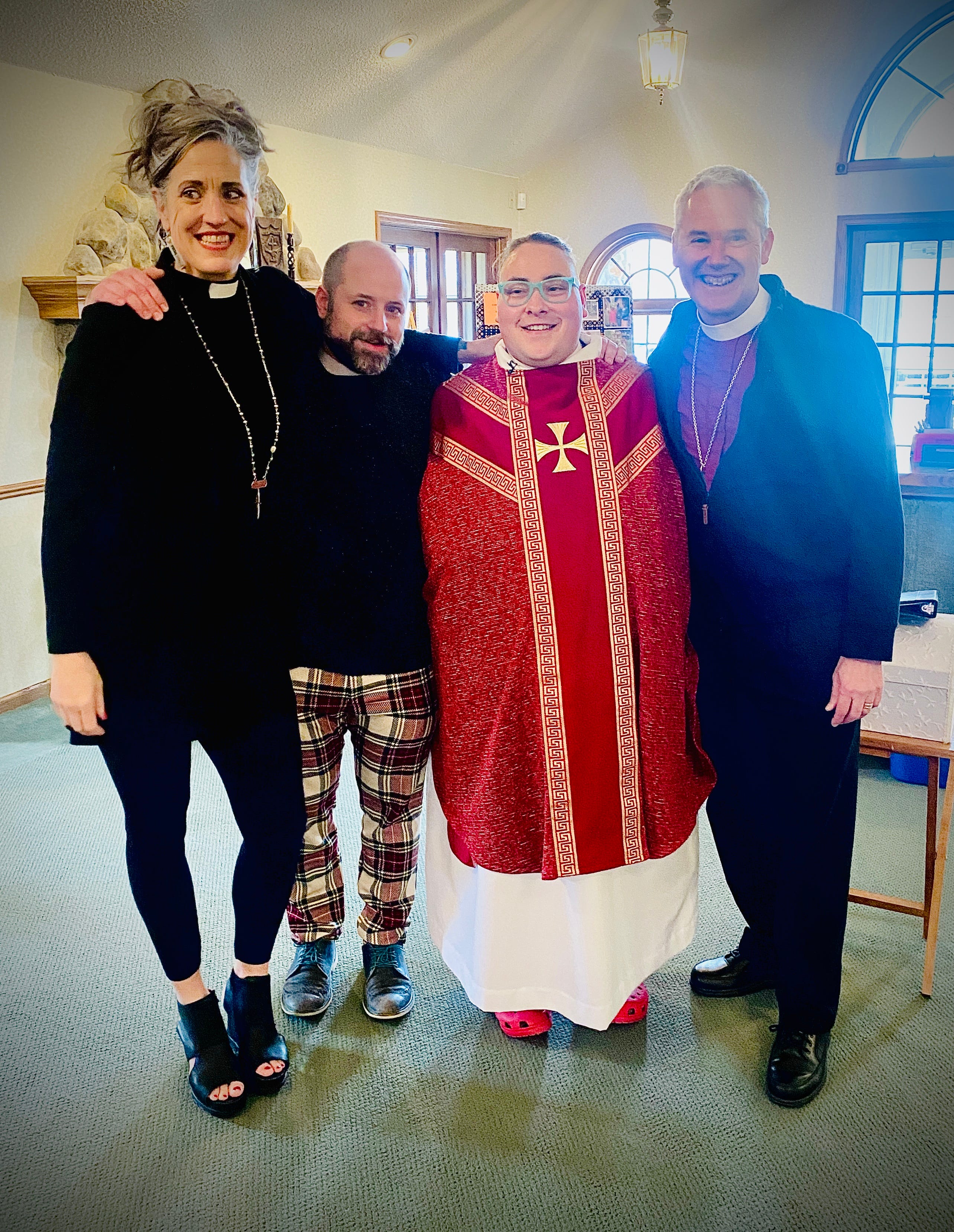 A female pastor, a gay pastor, and a non-binary pastor with the bishop who supports us all! (Me (founder and former pastor at HFASS, Rev. Reagan Humber, Senior Pastor at HFASS, Rev. Wylie Cook, newly ordained Associate Pastor at HFASS, Bishop Jim Gonia, Rocky Mountain Synod, ELCA)