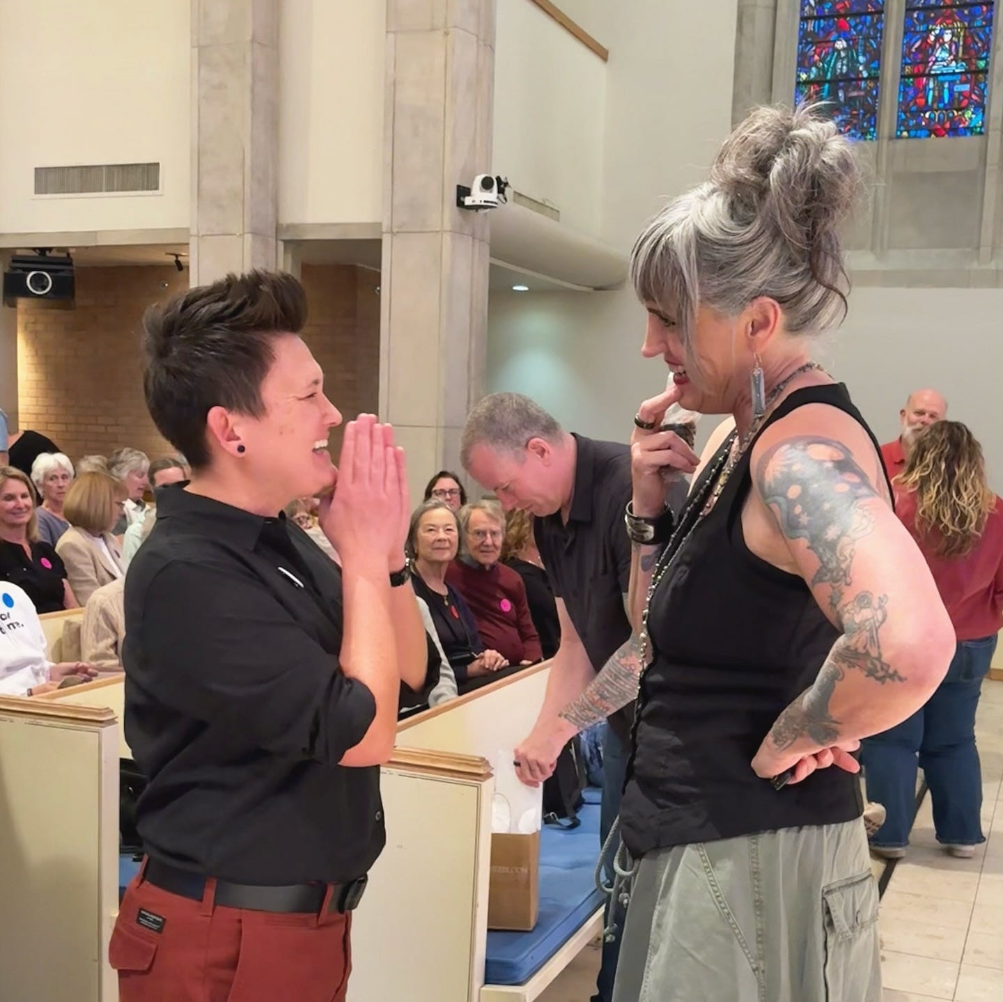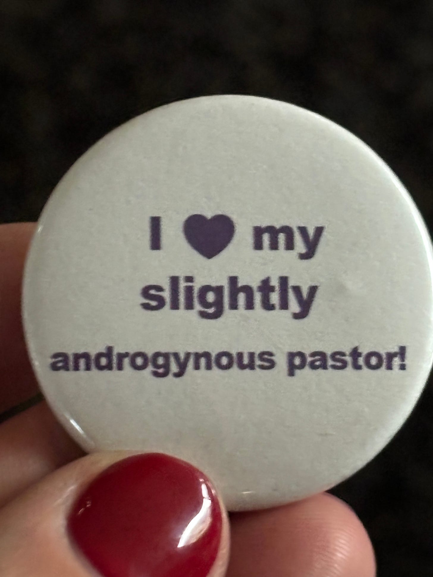 I give her the biggest hug, and when our embrace ends I see that she is wearing the I *heart* my slightly androgynous pastor pin.